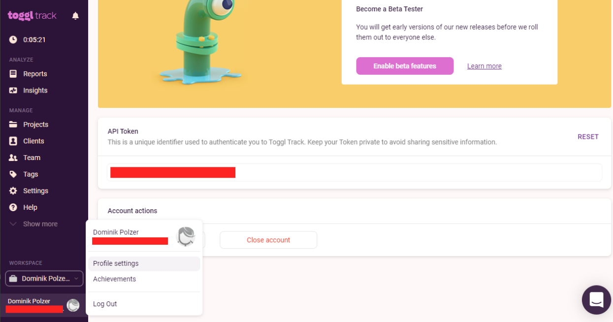 Your API token can help you setup custom integrations. Should you need to revoke this access to your Toggl Track account you can also reset the API. API tokens can be used to set up custom integrations.